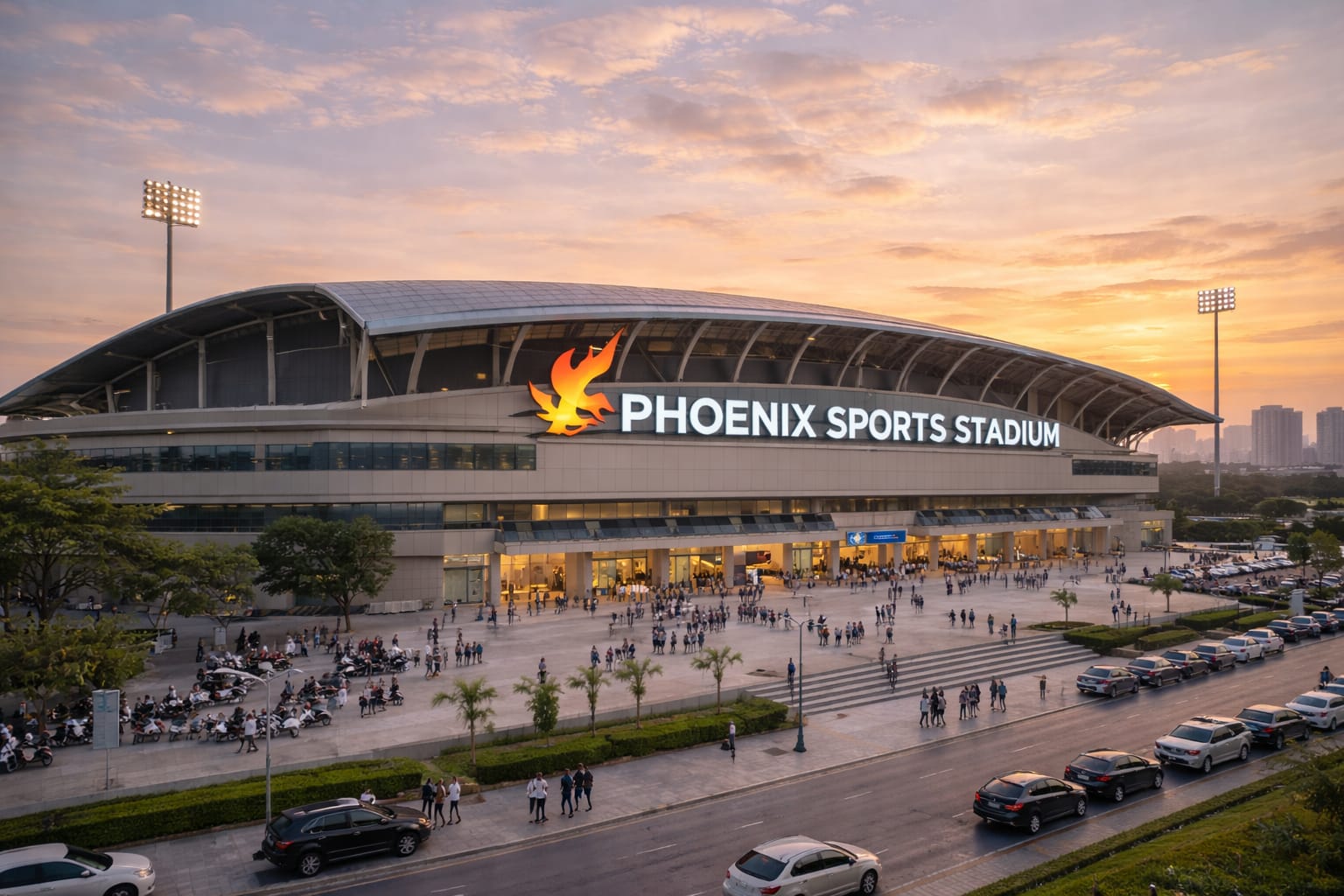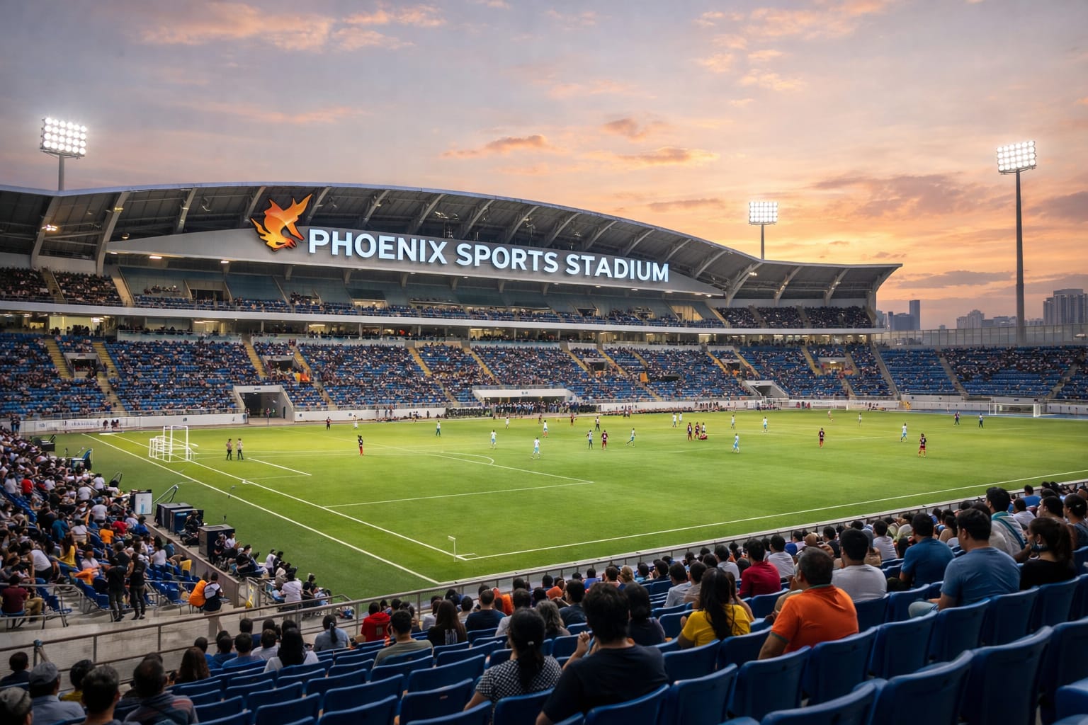 Multi-purpose sports arena seating 45,000 with retractable roof, premium suites, concession facilities, and advanced acoustics for concerts and events.